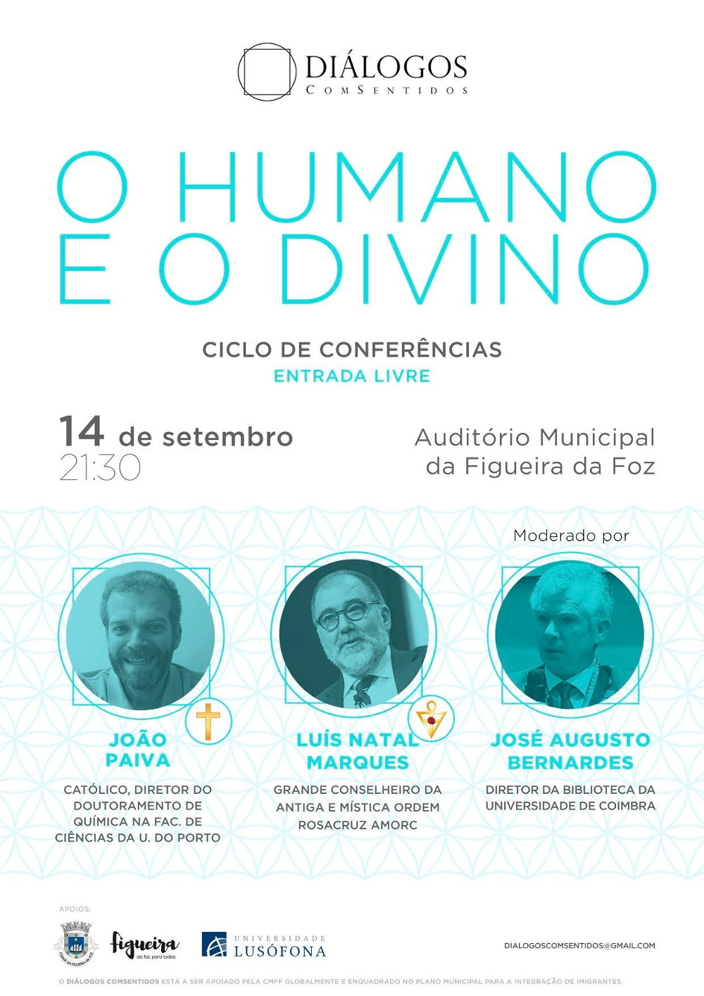 A 1ª Conferência:"O Humano e o Divino", decorrerá no dia 14 de setembro, pelas 21h00, no Auditório Municipal da Figueira da Foz e visa a partilha de reflexões entre o Católico João Paiva e o RosaCruz Luís Natal Marques, com a moderação de José Augusto Bernardes.