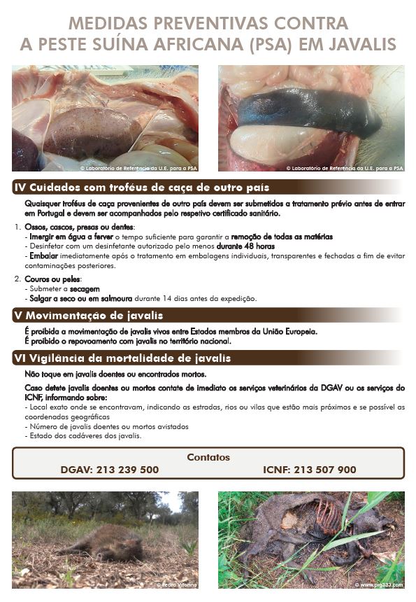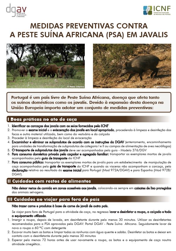 Alerta da Direção Geral de Alimentação e Veterinária e do Instituto da Conservação da Natureza e Florestas. Medidas Preventivas contra a Peste Suína Africana em JAVALIS.
