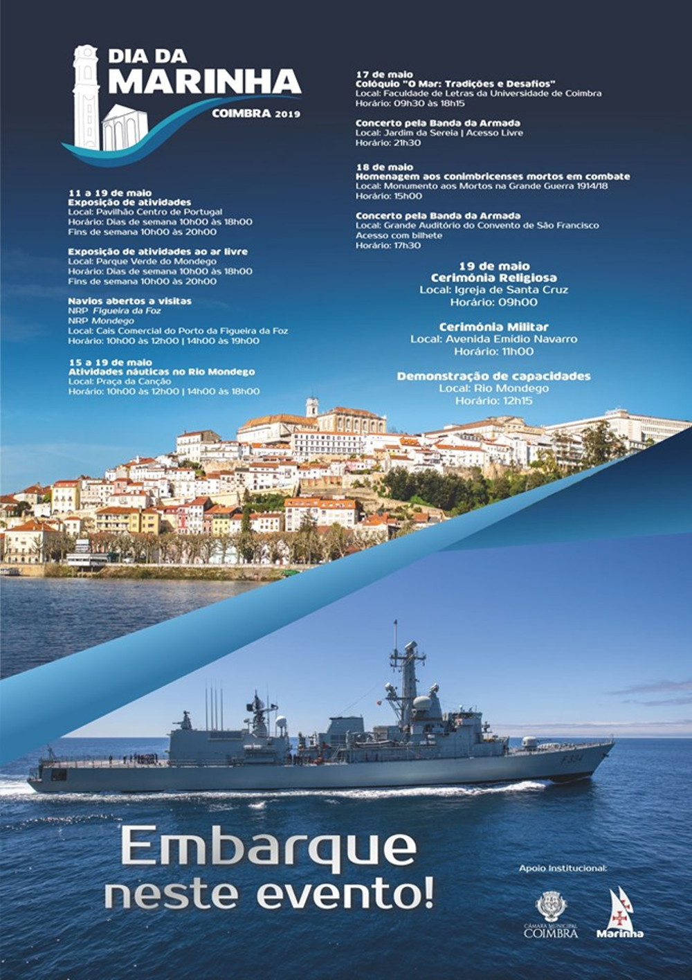 O programa estende-se, contudo, à Figueira da Foz, onde desde ontem e até 19 de maio podem ser visitados, no cais comercial do Porto da Figueira da Foz, os navios da Marinha NRP Figueira da Foz e NRP Setúbal.