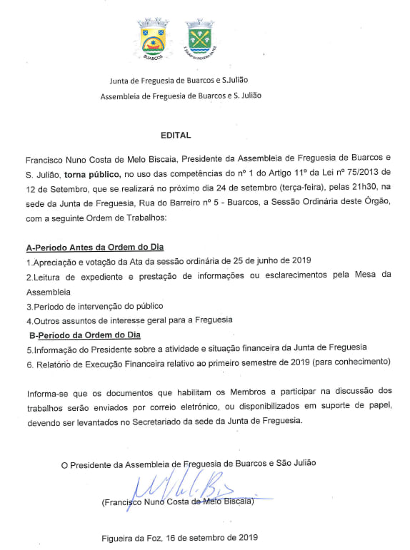 Assembleia de Freguesia 25 de junho de 2019 pelas 21h30 na Junta de Freguesia de Buarcos